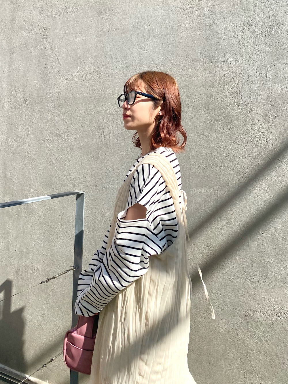 スリット入りのボーダーがポイント。 甘すぎないようメガネでカジュアルさを出しました!