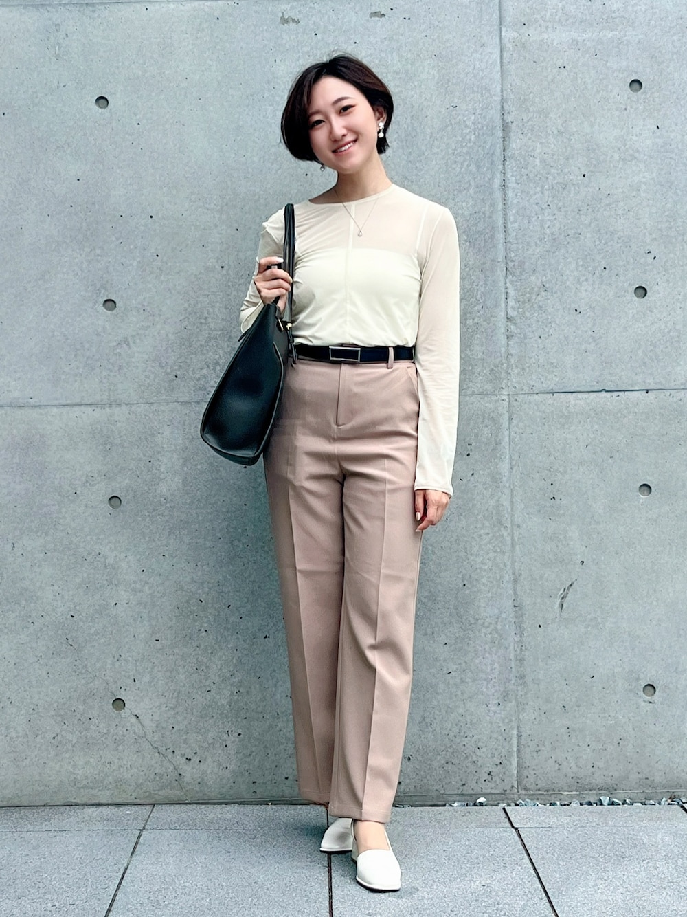 社内研修の講師初日なので、親しみやすさを出すために明るいカラーで統一しました! でも骨スト&顔タイプクールなので、黒ベルトでかっこよさを追加。 デザインはシンプルですが、シアーTとスクエアトゥパンプスの素材・形で遊んでます