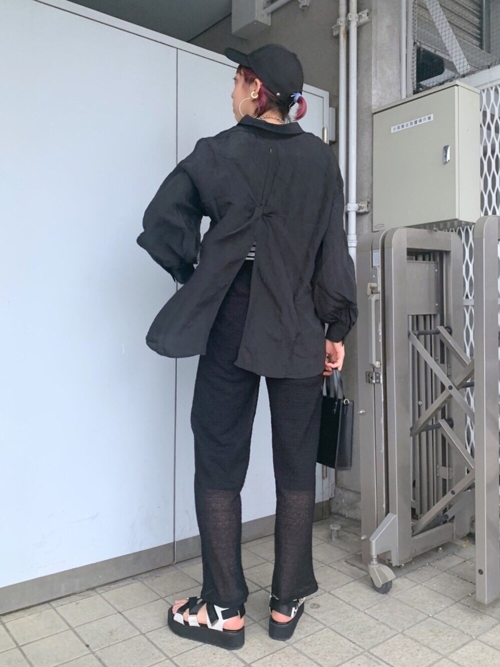 オールブラックコーデに インナーやサンダルで柄を取り入れて コーデのアクセントに!! トップ、ボトムともに 生地のシワ感そしてシアー感があるので オールブラックでも重たくならず 涼しげな軽い印象で着れます☆ 《Instagram:@_tamu_pageboy》