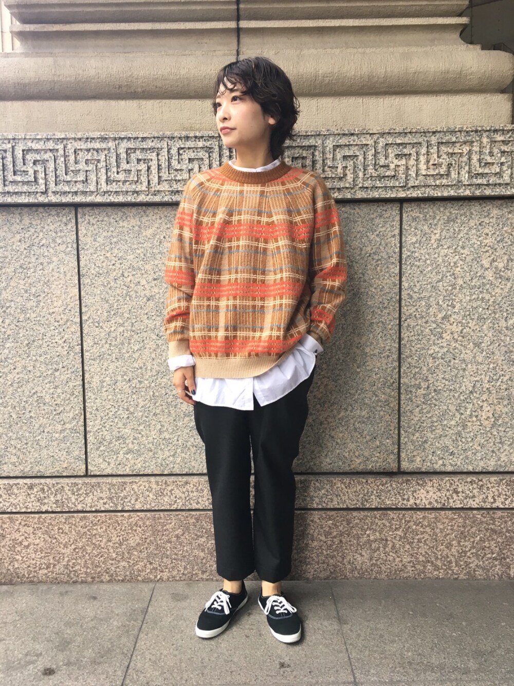 インパクトのあるunfilのニットに シャツを合わせたレイヤードスタイル。 1枚で主役になるトップスには 柄を中和してくれる中間色の グレーのパンツをチョイスするのが オススメです。