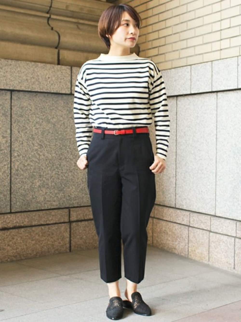なめらかな肌触りが魅力のボーダーコットンニットは、 これからの季節にぴったりの一枚です。 光沢感のあるツイルパンツを合わせれば、 カジュアルに偏り過ぎない上品なルックスに。 赤のベルトでスパイスをプラスした、大人マリンスタイル。