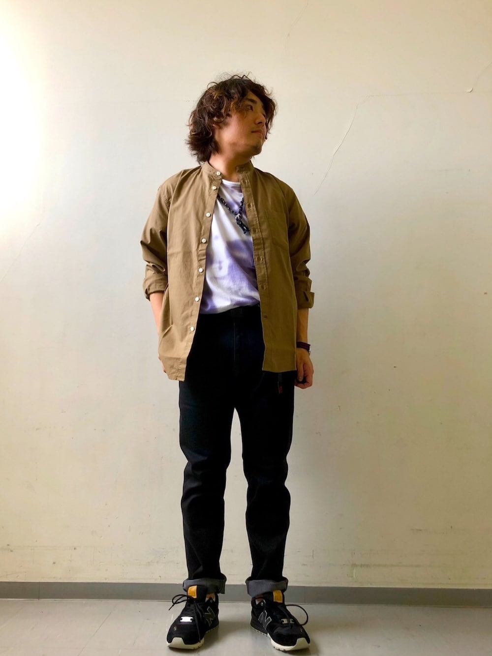 ストレッチの効いたグラミチデニム イージーケア素材のバンドカラーシャツ new balanceの CM996 快適さの極み