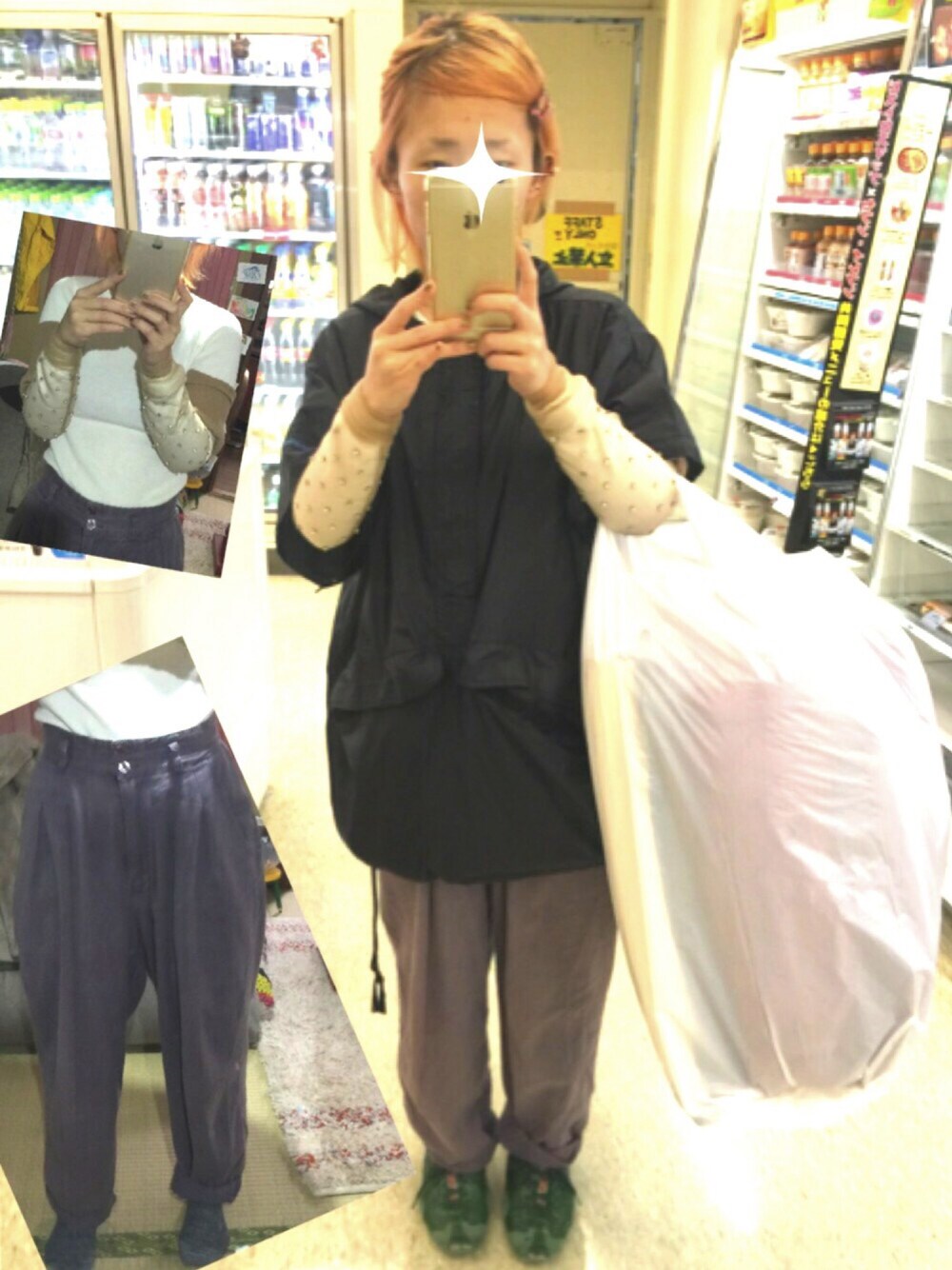 毛布目当てで近所のお店へ。荷物を大きくなるの予想できたから、手ぶらできるポケットいっぱいブルゾンを着ました。 パンツは今はなきヨーロッパ古着のお店で買ったもの。だいぶくたってるし、色もくすんだ紫。わたしは、はき続けます。