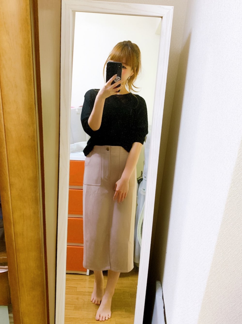 暑い暑い!! でもなんとなく秋服が着たい! ってことで、ピーチスキン素材のタイトスカートを♡