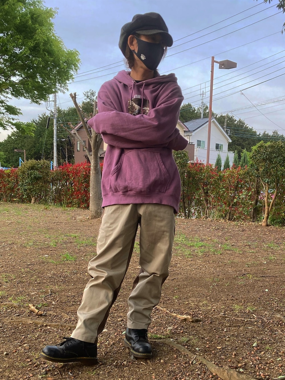 GUのシェフパンツMYベージュにパープルのパーカーでシンプルコーデにしました。 昔買ったマーチンのブーツで、お決まりのキャスケットです♪