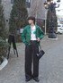 シルエットが良すぎるストライプスラックスに差し色緑革ジャン合わせるの好きかも。