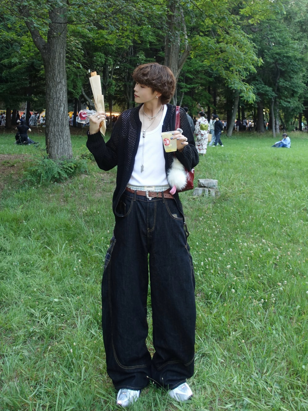 夜は涼しいから羽織れるメッシユニットで、ボトムスは暖かくレイヤードスタイル