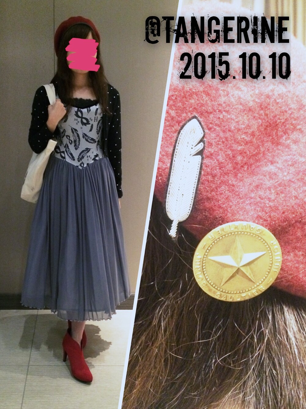 秋です。 ロングワンピをちょっとパンク風にしてみた…つもり。 ベレー帽にちょこっとおまけ。 羽根のブローチはMACON & LESQUOY。 バッヂは古いGAULTIER。