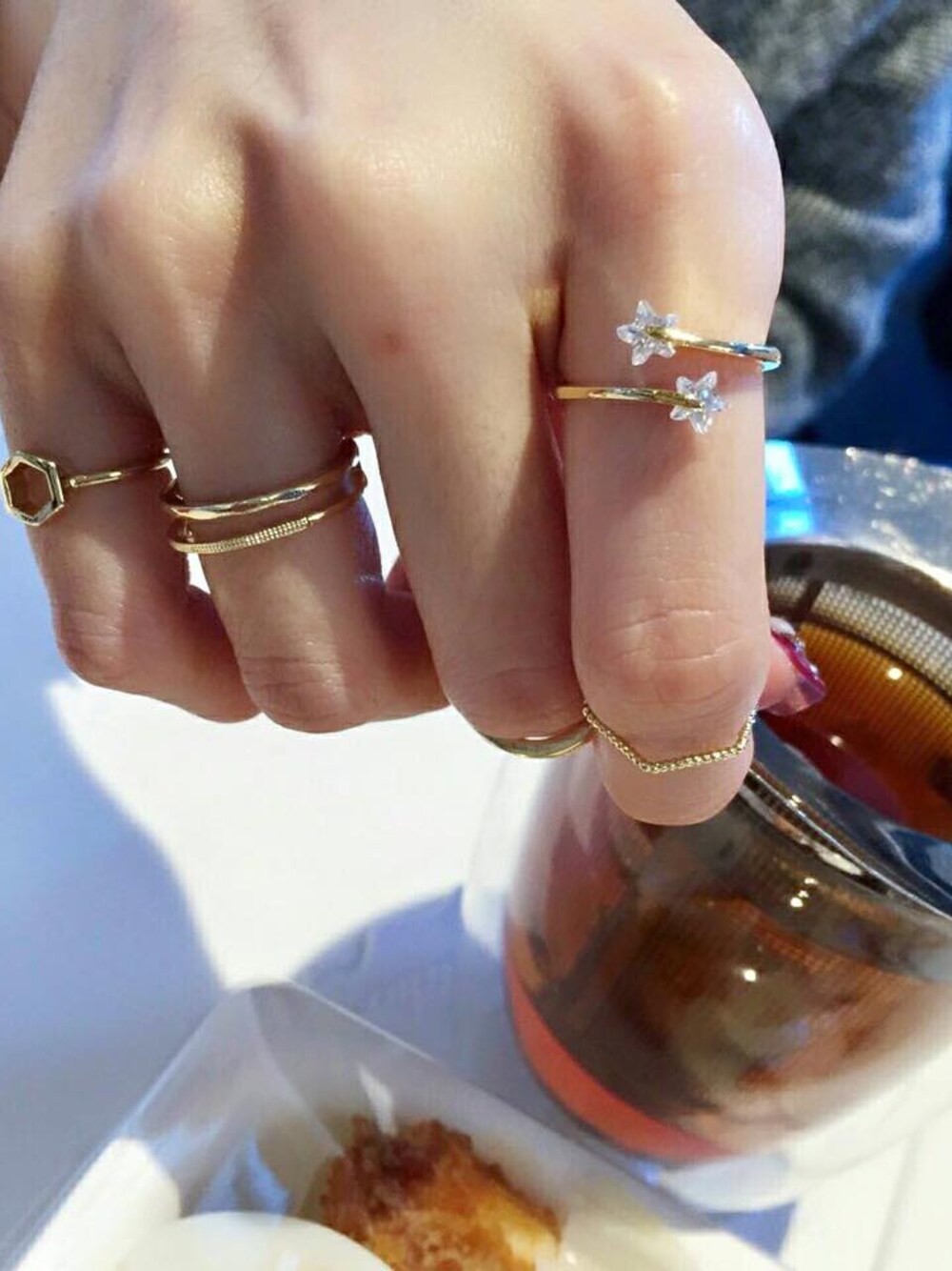 Index finger: Star Duo Ends Gold Ring (adjustable size) ; Hexagonal Gold Mid Ring (from set of 4) Middle finger: Railway Gold Ring (from set of 4) Ring finger: Duo Band Gold Ring (from set of 4) Pinkie: Hexagon Set Gold Mid Ring (from set of 4)