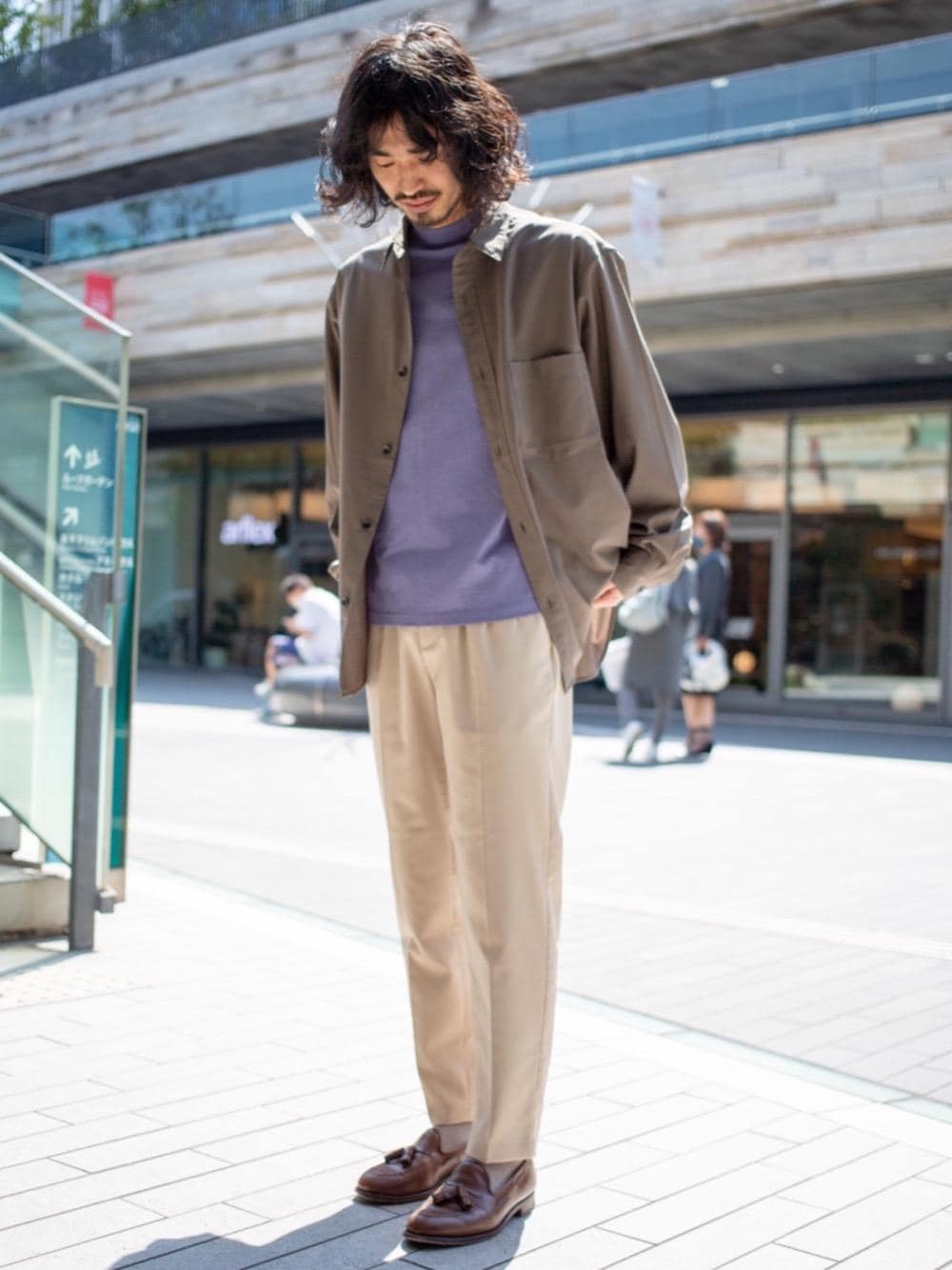 【身長:169㎝ size/全てSサイズ】 春先の気温調整が難しい季節にオススメのシャツ羽織りコーディネートです。シャツとパンツは柔らかい素材で色味もベージュ系で落ち着かせ、インナーのTシャツは無地を選ぶことで、程よいアクセントに。