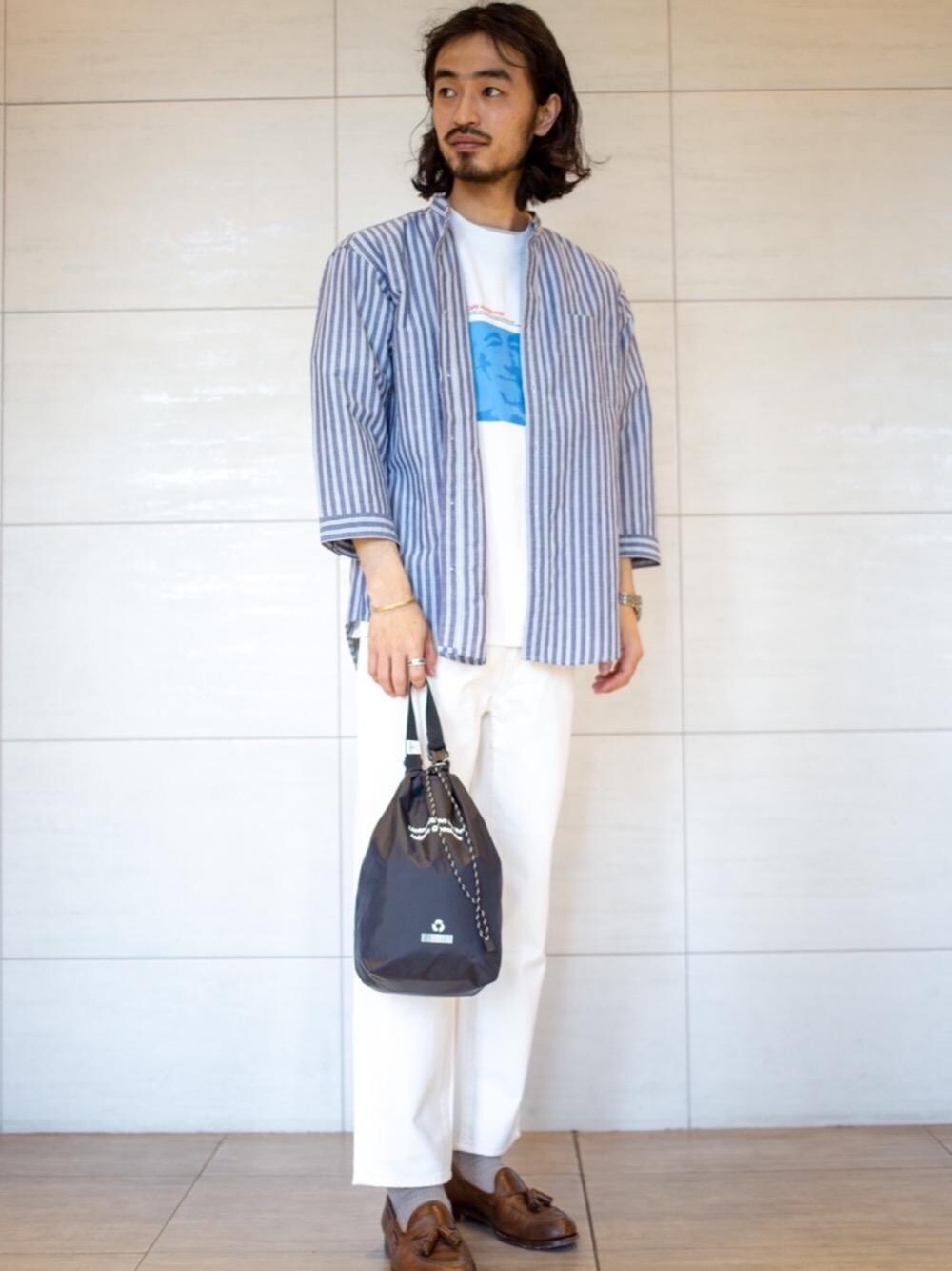 【身長:169cm】【サイズ:全てSサイズ】 カジュアル見えしやすい7分袖シャツスタイルをホワイトとブルーに統一することで夏らしい爽やかなキレイめなスタイルにまとめました。さ