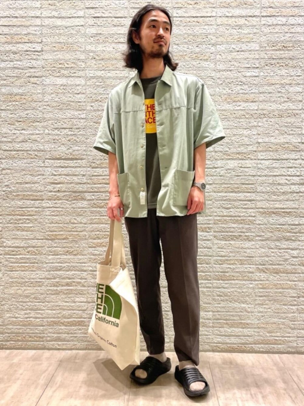 【身長169cm】 ノースフェイスのTシャツとバッグを主役にしたアウトドアコーデです。シャツもグリーンに統一する事で全体のまとまりは大事にしつつもノースフェイスのロゴを目立たせました。足元は夏の新定番のhokaoneoneのリカバリーサンダルでアウトドアらしく合わせています。