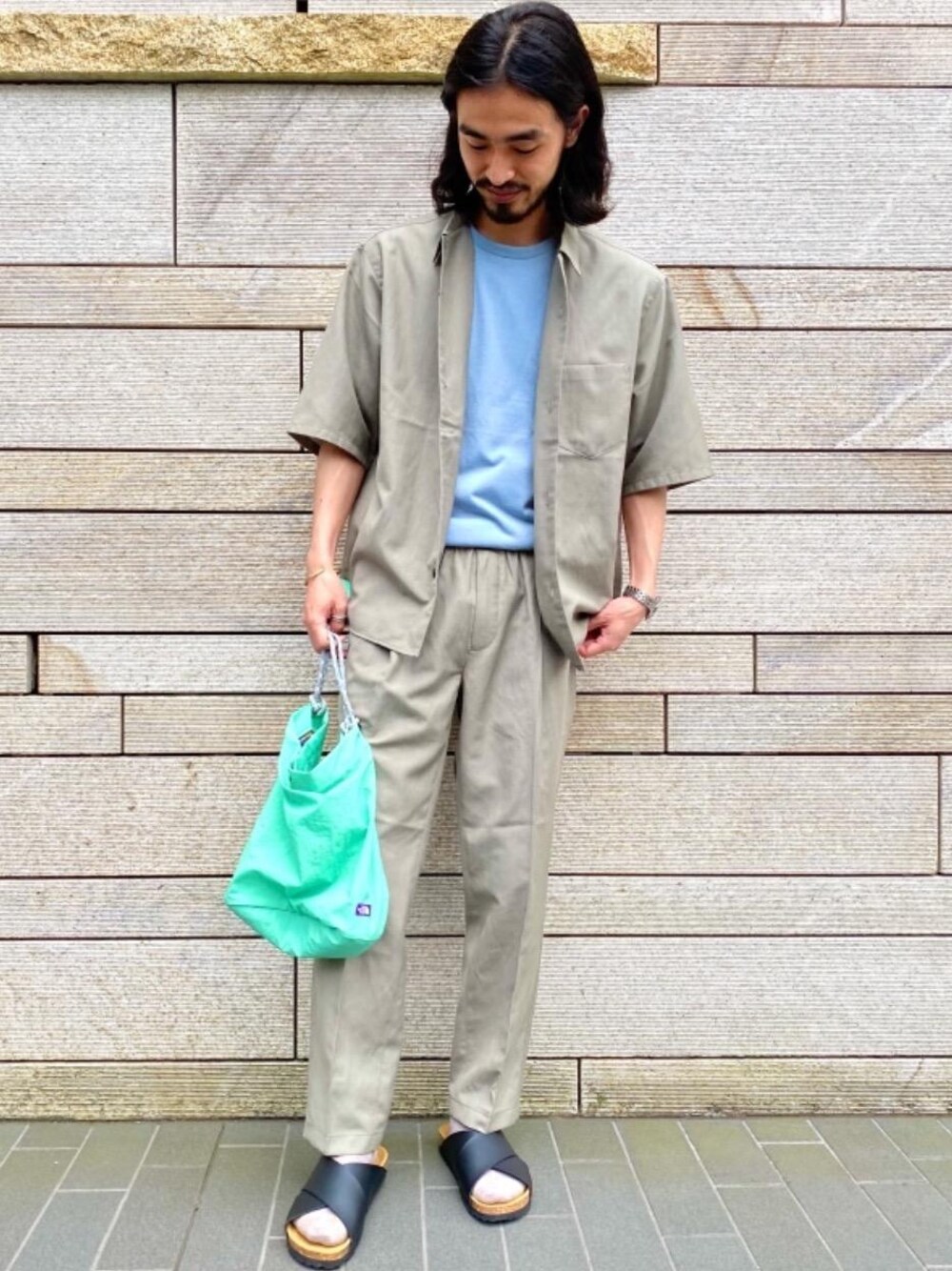 【身長169cm】 気温の上がってきた初夏にオススメのシャツセットアップスタイルです!淡い色味のお陰でセットアップでも決めすぎた印象になりづらくとても使いやすいです。上下共に少しゆったりしたシルエットで、シャツの袖が少し長くなっているのもインナーを選ばず使いやすいポイントです!足元や小物はサンダルや色モノで夏らしく。