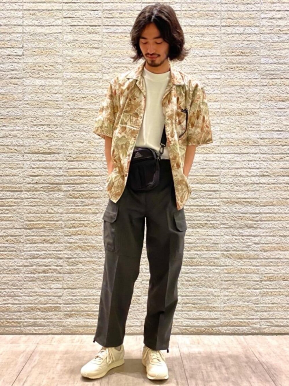 【身長169cm】 夏の定番、柄シャツで合わせながらもキレイめにまとめたコーディネートです。 インナーや小物の色味を極力シンプルに合わせ、パンツもスラックス調のものにすることでシルエットも程よくスッキリとまとめました。