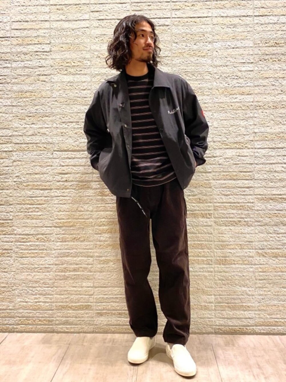 身長:169cm 普段サイズ:シャツS/トップス S/パンツS/シューズ26.0cm [サイズ感] アウター:ゆったり目 トップス:標準的 パンツ:ゆったり目 シューズ:細め [コーディネートポイント] 涼しくなってきた季節に軽く羽織りやすいコーチジャケットスタイルです。全体的に色のトーンは暗めで落ち着かせていますが、コーデュロイのパンツやボーダーのトップス、ジャケットのロゴなどさりげないポイントでシンプル過ぎないように合わせました。