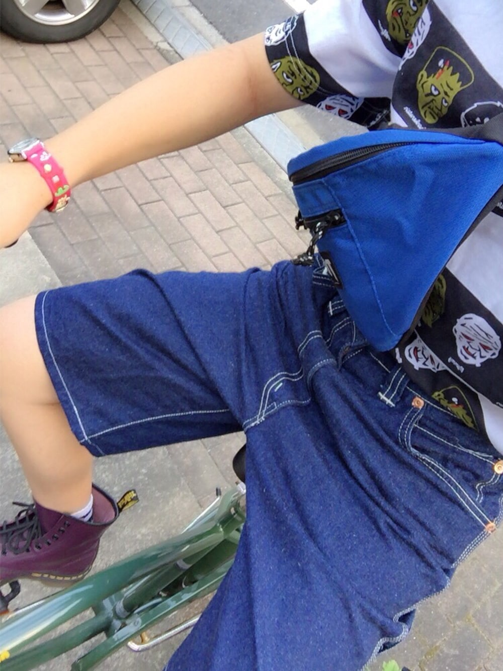 パープル系のブーツを着用したレディースの夏コーディネートの1枚目の写真