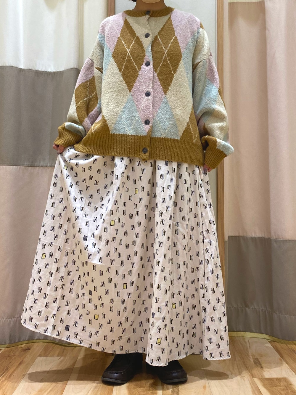 ご覧くださりありがとうございます🐰 大きめのアーガイル柄が可愛いカーディガンと 小さなbook柄のスカートを合わせました📚♡ 柄×柄も挑戦してみると意外と可愛いなと気づきました☺️💭