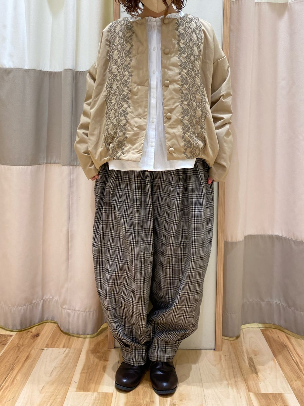 ご覧いただきありがとうございます🐰 春物のジャケットを使ったコーデです☺️ 綺麗な刺繍が施されていて まるんとしたシルエットが可愛いジャケットです❁⃘*.゚ 中綿で暖かいので今からでも着ていただけるアイテムです⸜🙌🏻⸝ パンツは裾のタックがとても素敵で ふんわりとしたシルエットで 楽に履いていただけるアイテムになっています🎶