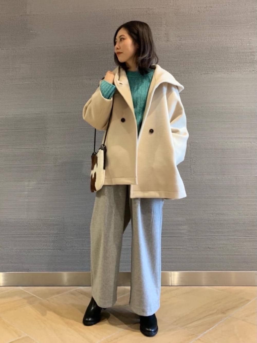 ●30代後半 ●身長162㎝ ●普段サイズ :トップス36/ボトム36か38/シューズ:23.5㎝か24㎝ 【サイズ感】 アウター:身幅ゆったり ニット:着丈お尻上、袖丈長めのゆったりサイズ ボトム:標準的 シューズ:標準的 【コーディネートポイント】 大人なフーディーコートをメインに、ライムカラーが鮮やかなニットと肉厚でカジュアルなワイドパンツを合わせた冬のコーディネートです。アウターの袖からのぞく袖丈長めのカラーニットがワンポイント!