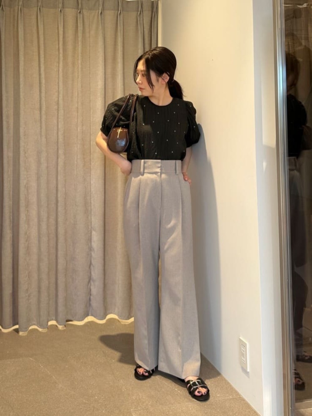 【サイズ感】 ブラウス:標準的 肘上丈 ボトム:標準的 甲にかかる着丈 【コーディネートポイント】 フェミニンなハート刺繍のブラウスを美シルエットなパンツ合わせで、きちんと感あるコーディネートにしました。 通勤にもオススメなスタイリングです。