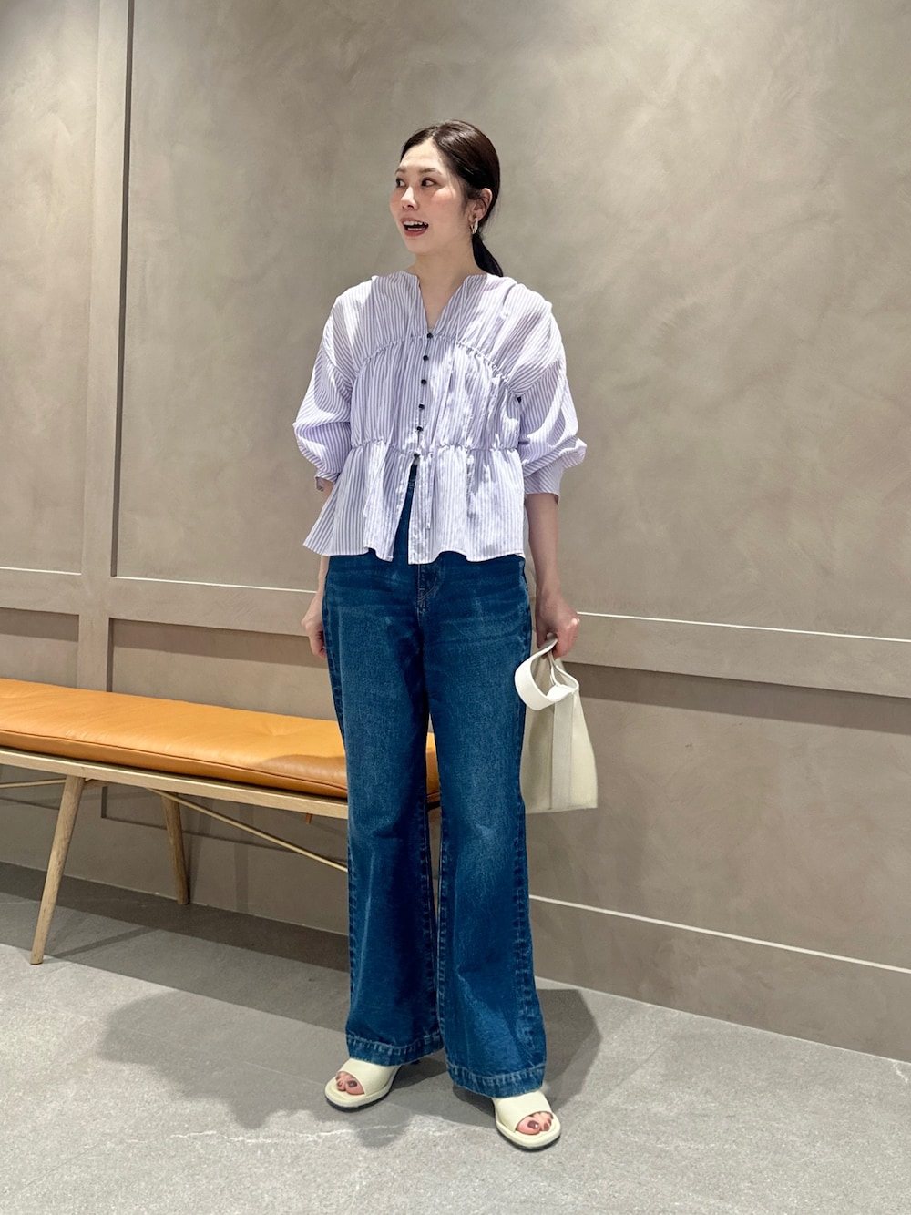 ●身長 162cm ●普段サイズ:トップス 36/ボトム 38/シューズ 24cm 【サイズ感】 トップス:身体のラインは拾わないゆったり シルエット フロントのゴムは締め付け感なし お尻にかかる着丈 ボトム:ハイウエストですが苦しくないゆとりももあたりもゆとりあるデザインシューズの甲につく着丈 【コーディネートポイント】 カジュアルなデニムをフェミニンにコーディネート。 軽さのある素材でさらっと着られ、女性らしいカラーのストライプが春らしいポイントになります。