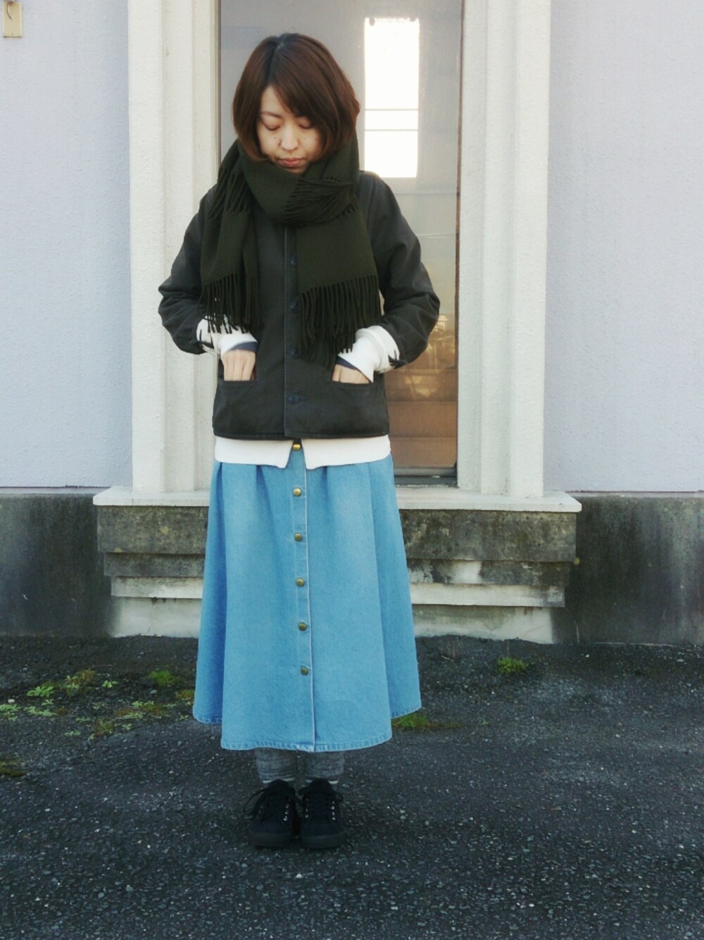 このストールお気に入りなんです◯ かれこれ6年くらい大切に使っています。 この日はタイツと靴下とニットのレギンスを 履いていました◯