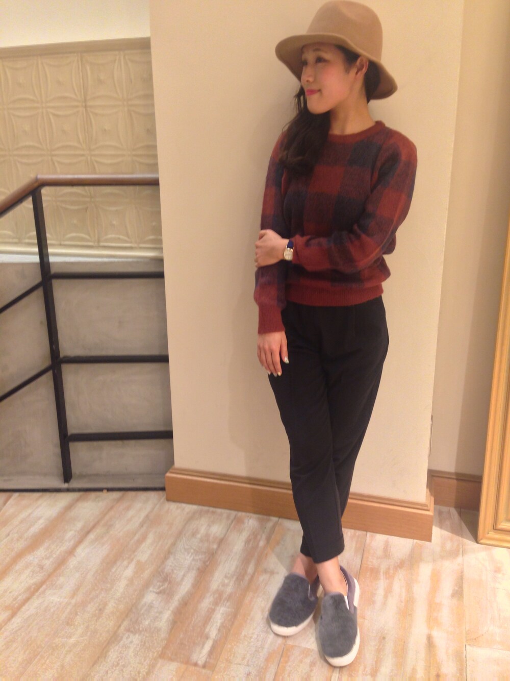 チェック柄のモヘアニットがメイン。 タックパンツと合わせて大人カジュアルに着るのが気分♪ ファースリッポンはシンプルコーディネートのアクセントにぴったりです^^