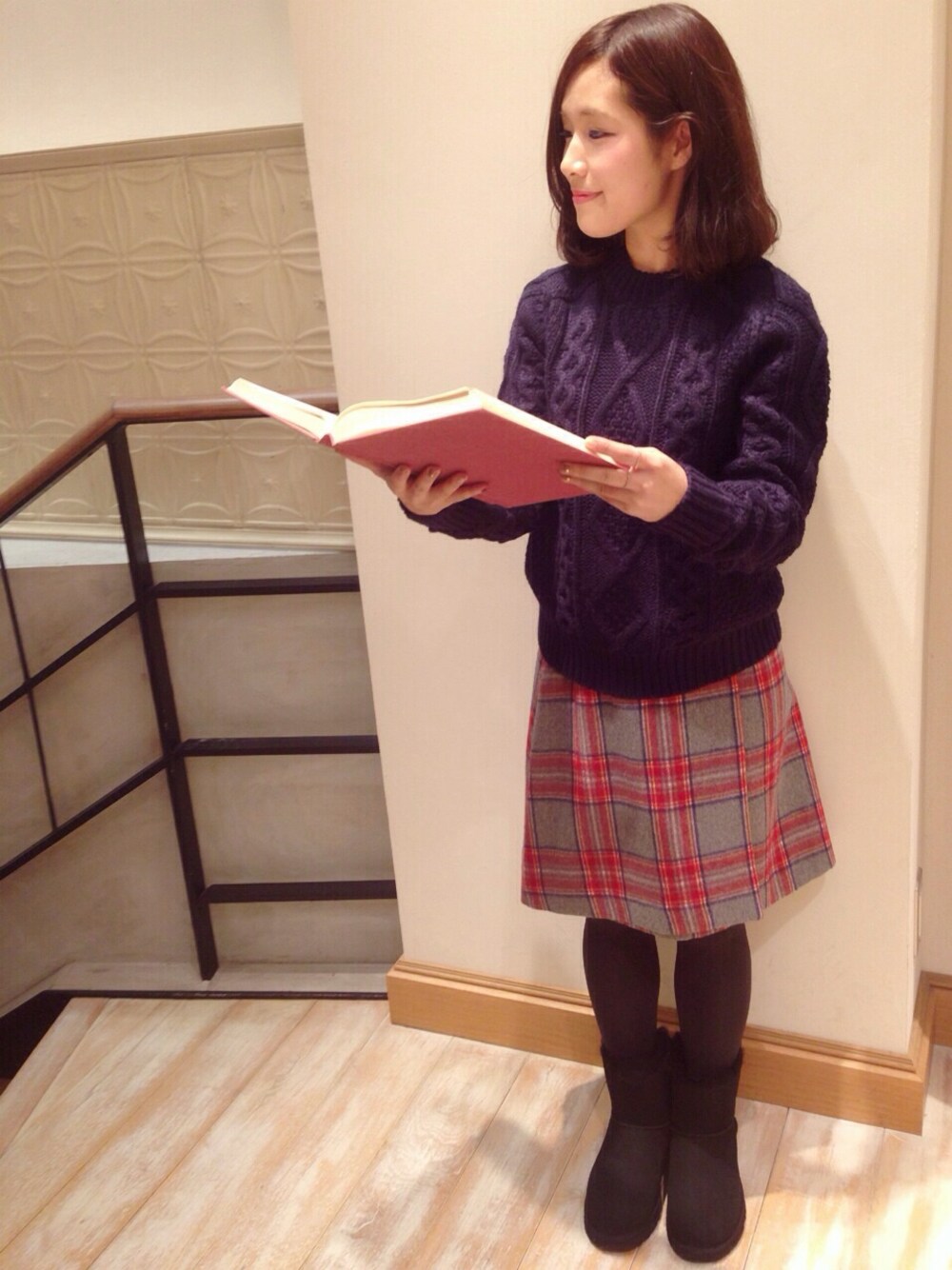ウールのチェックスカートとアランニットでスクールガール風♪ トップスもスカートも、形にこだわったアイテム。