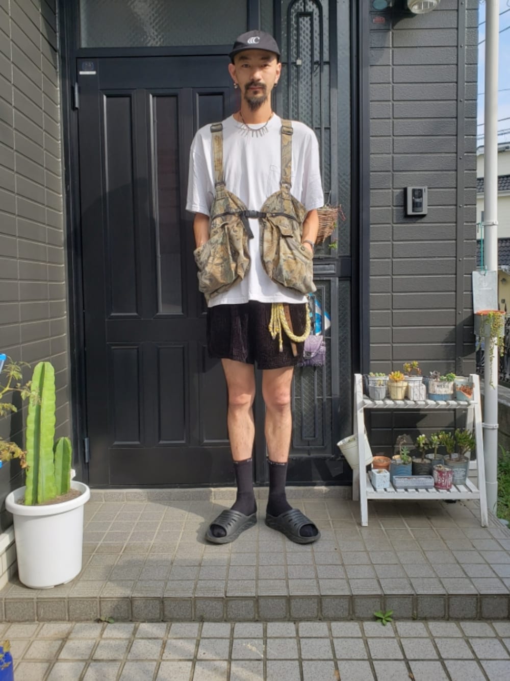 いつもたくさんのいいね、閲覧、お気に入り本当にありがとうございます。 今日の一枚。 ハンティングベストをメインにコーデを組みました。 その他の色目をモノトーンにし 更にhokaのシャワーサンダルで抜け感を出しました。