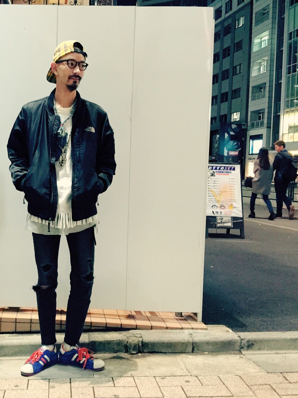 今日の一枚 ノースフェイスのMA-1を主役にコーディネート。 キャップ×スニーカーでストリート感を加速させました。