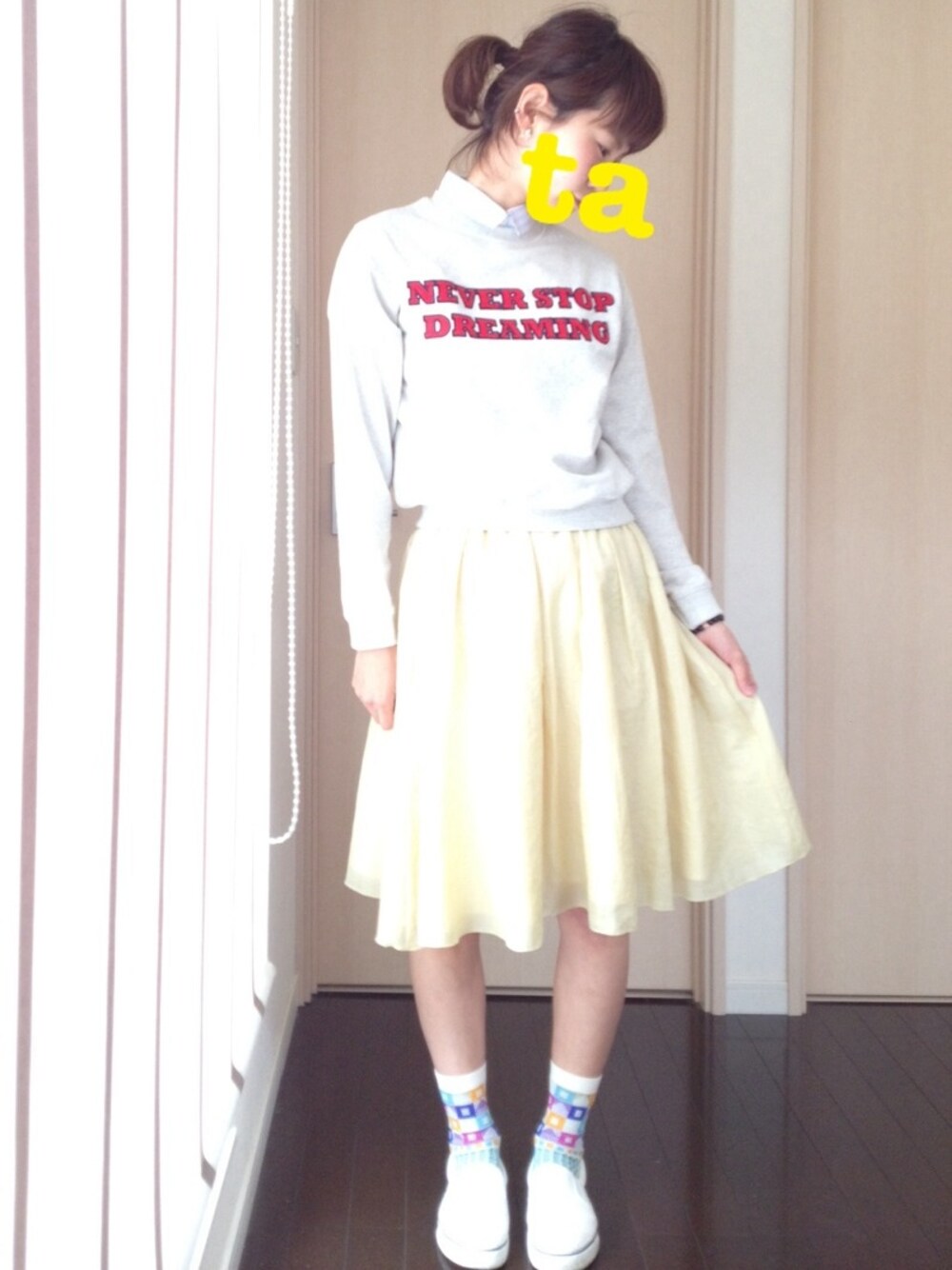 初投稿♡ thpry+colorのスウェットに黄色のスカート合わせてみた♡ やっぱり可愛いこのスウェット♡ 買ってよかった♡ トップス thpry+color スカート Te chichi 靴下 靴下屋 スニーカー 無印
