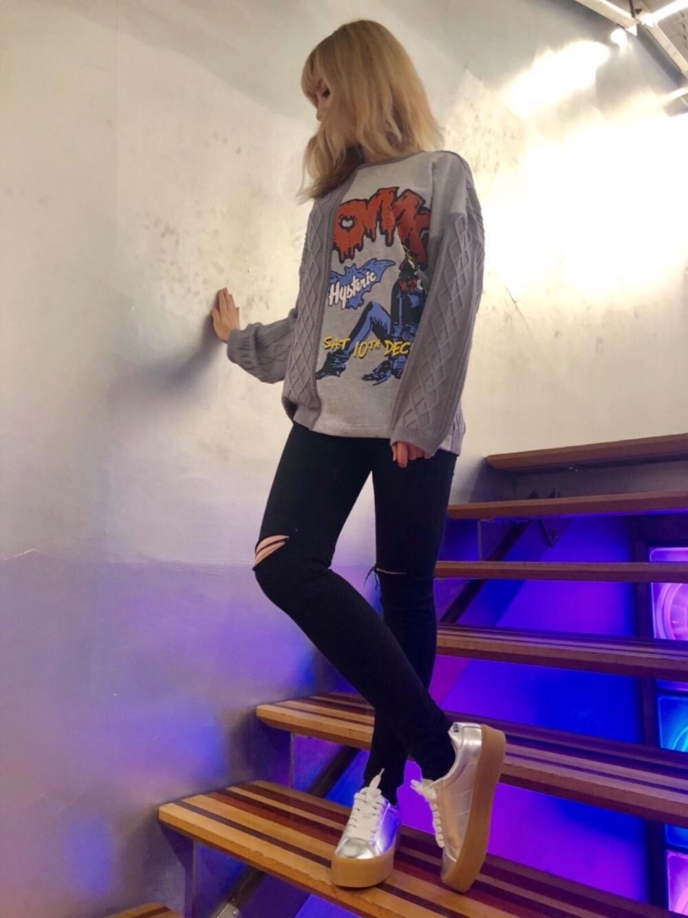 針織衫與衛衣弁接款的上衣搭配銀色運動鞋的休閒裝扮。styling with OMG KNIT. ニットとスウェットの切り替えしプルオーバーとシルバーのスニーカーをカジュアルテイストで着てみました。