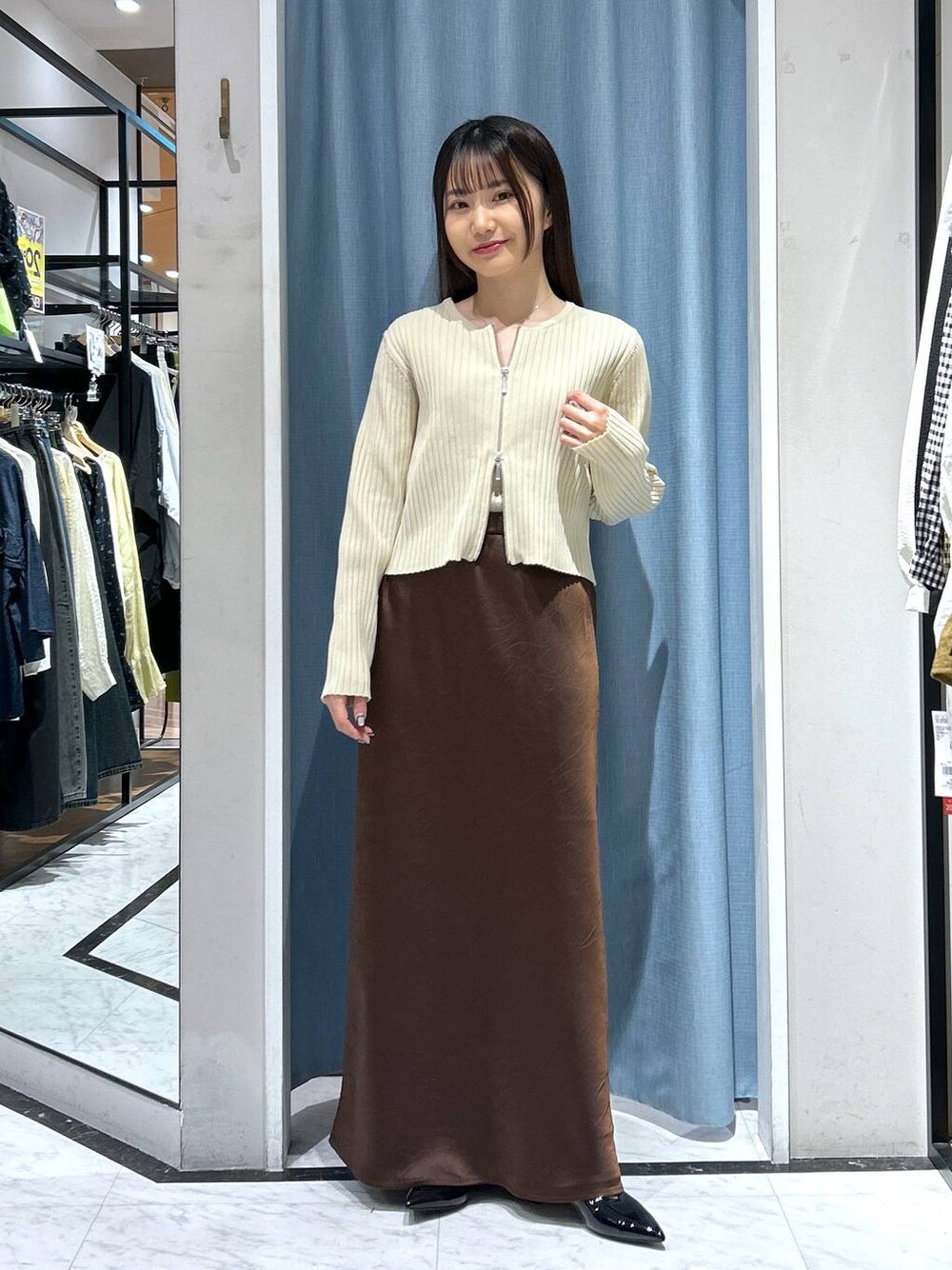 【トップス】→フリーサイズ wzipで逆開ファスナーが今年らしく、一枚でも羽織りとしても着ていただけます!クロップド丈なのでハイウエストなボトムスと相性抜群です!程よいタイト感なので、二の腕のラインも拾いにくいですよ◎ 【スカート】→Sサイズ シワ加工が施されたサテンスカート♡ フレアシルエットなので女性らしい印象になります! ウエストがオールゴム仕様なのでストレスフリーで着ていただけます!
