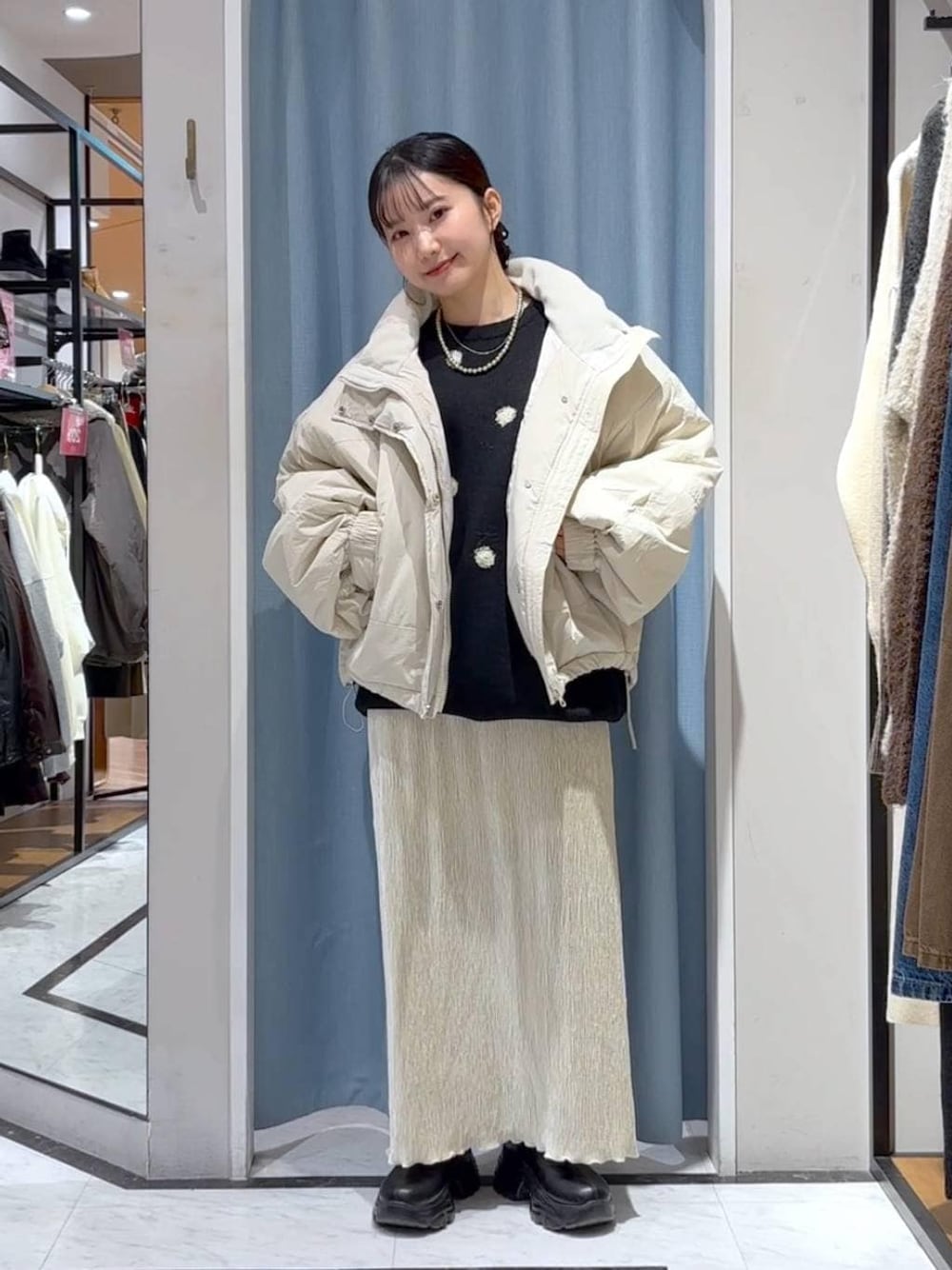 【アウター】→フリーサイズ 毎年人気のモンスターコートにショート丈が登場! エアサーマルという軽くて保温効果のある素材を使ってるので、真冬まで暖かく着れます!上まで閉めれば、タートル部分の内側がボアになってるのでマフラーいらずで暖かいです! 撥水加工があり雨の日でも安心して使っていただけます◎ 裾ドロストで絞ればバルーンシルエットになり可愛いです!両サイドにチャック付きのポケットがあるので便利!