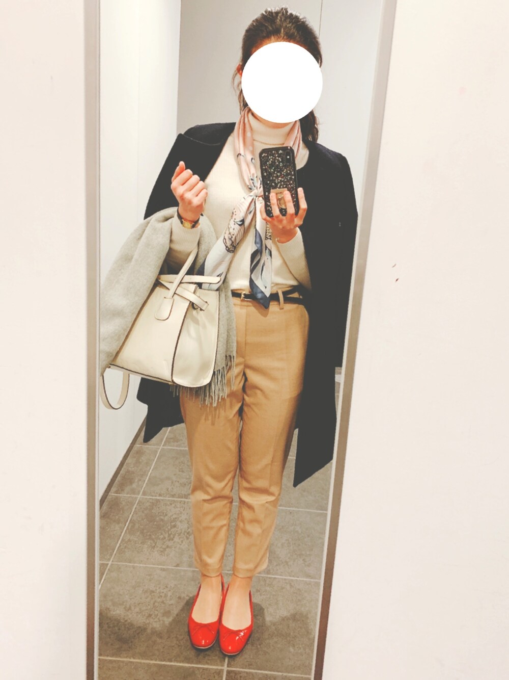 ベージュのパンツ履きたくて、スカーフしたくて。 帰りは自転車…雨ふりませんように🙏🏻