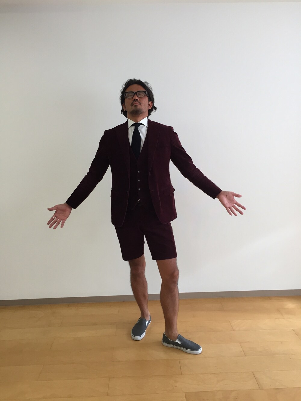 エンジのコーデュロイのスリーピース。短パン加工済。ウールのタイもネイビー✖️エンジにして、全体的に色目を合わせてみた。 でも足もとはVANSのスリッポン。外しのテクニックがたまらんのよ。