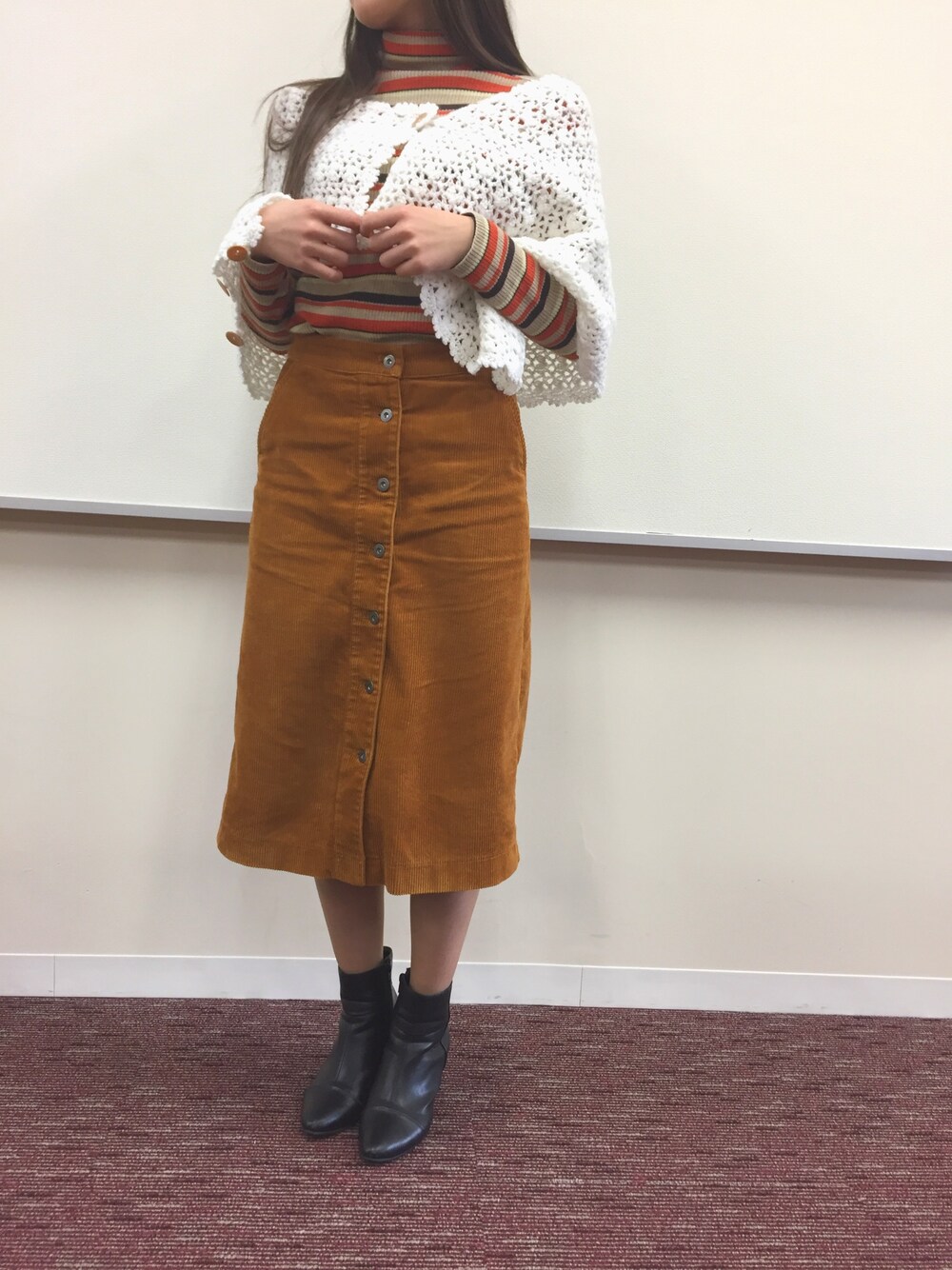 「ちえちゃんねる」のスカート「コーデュロイフロントボタンスカート(ハイウエスト・丈標準69~72cm)」を使ったコーディネート