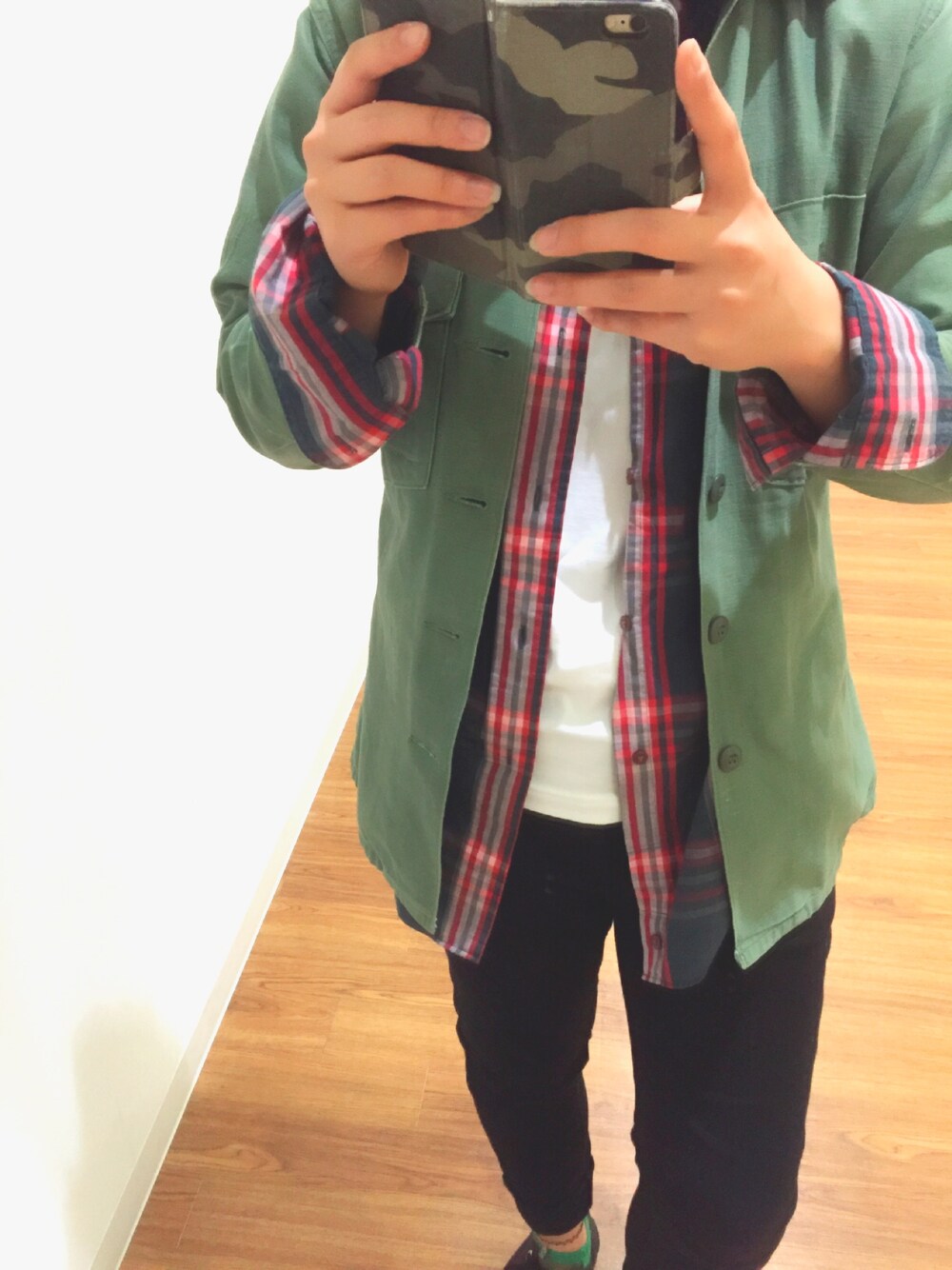 グリーン系のミリタリージャケット、レッド系のシャツ/ブラウスを着用したレディースの春コーディネートの1枚目の写真