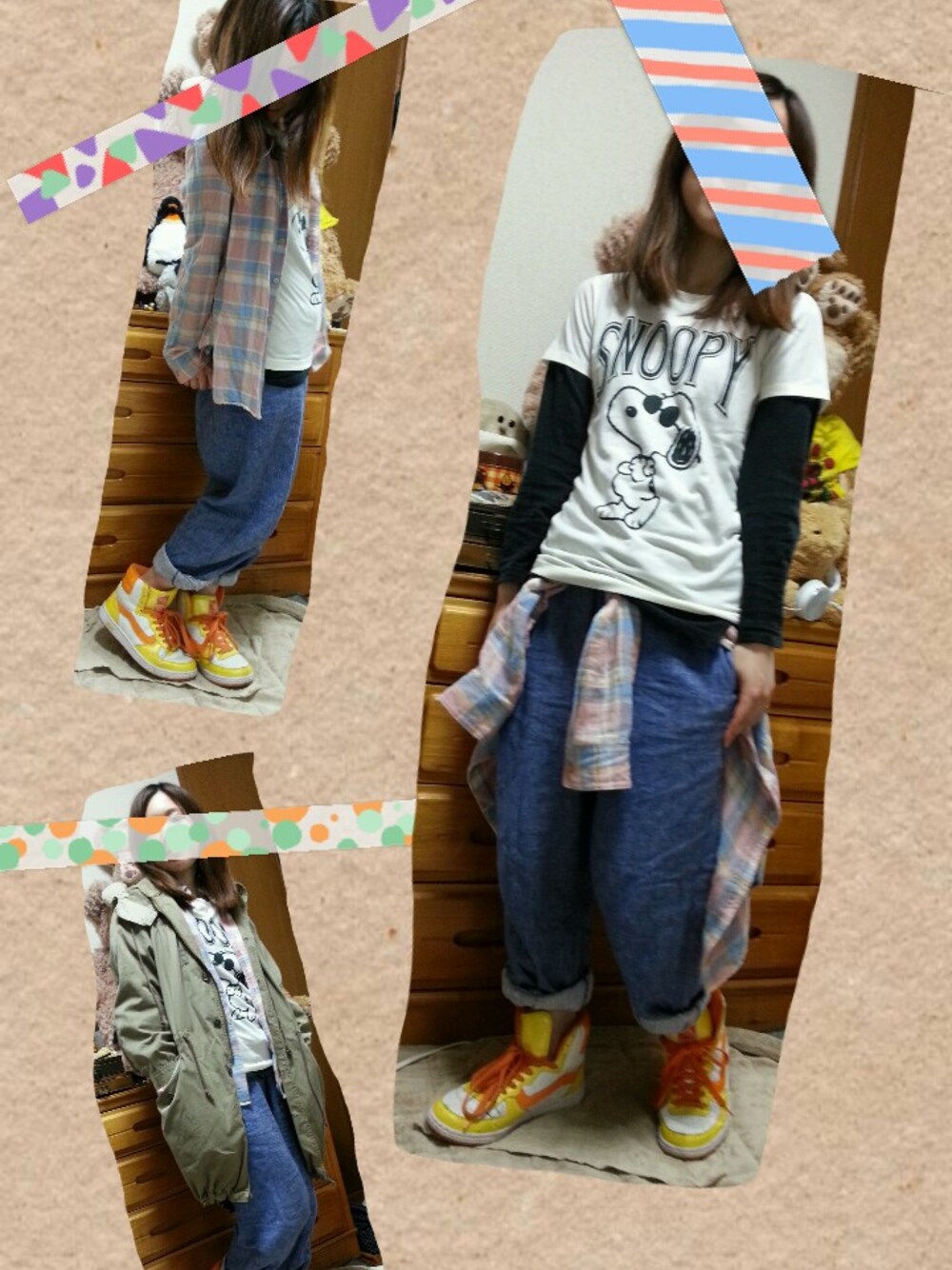 コート:KBF Tシャツ:UNIQLO カットソー:sm2 パンツ:sm2 チェックシャツ:ehka sopo ゆるっとコーデ(^^) らくちんでお仕事も動きやすかったです! でも、ちょっと、盛りすぎた…かな?