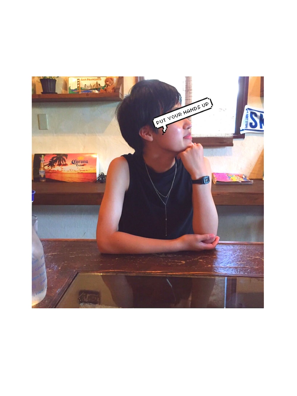 こんばんは! 夏休み、 沖縄の砂辺のカフェレストランにて🍖 沖縄に来たら是非一度は北谷方面の砂辺というスポットへお越しを!!!!✔️ 黒のトップスはシンプルなのにかっこよくキマるからお気に入りです〜〜早く夏来てほしい!🔥 トップス INGNIにて¥0(友達からのプレゼント) ネックレス どこかのお店で約¥1000 時計 某フリマサイトにて¥1000ちょっと