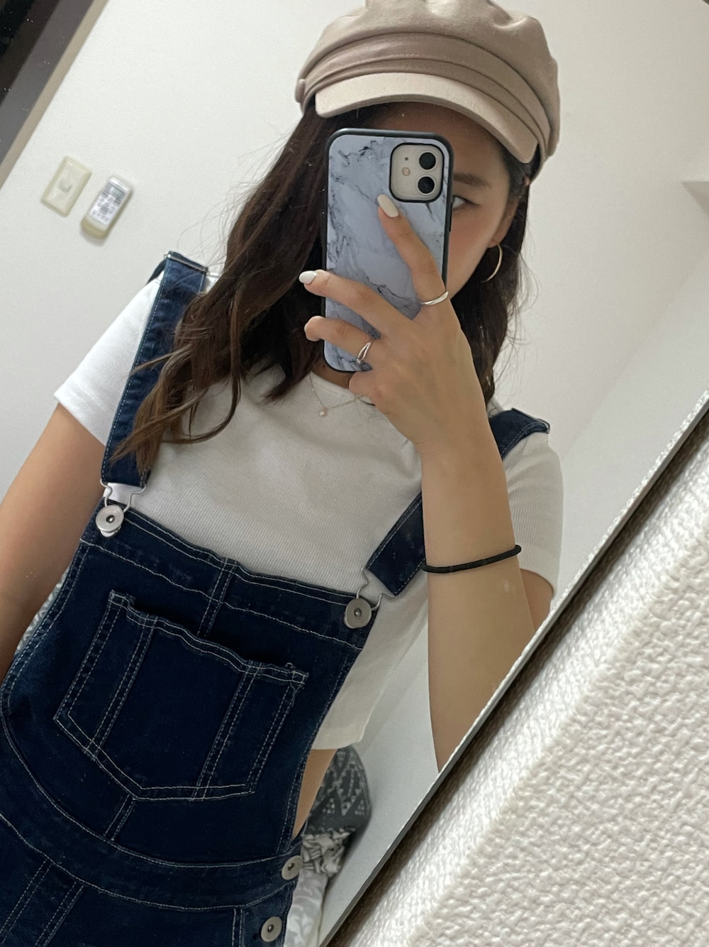 今のアクセサリーはゴールドとシルバーの2色使いがトレンドらしい🤍 夏らしくチビTにスキニーサロペットで合わせてみた🤞❤️