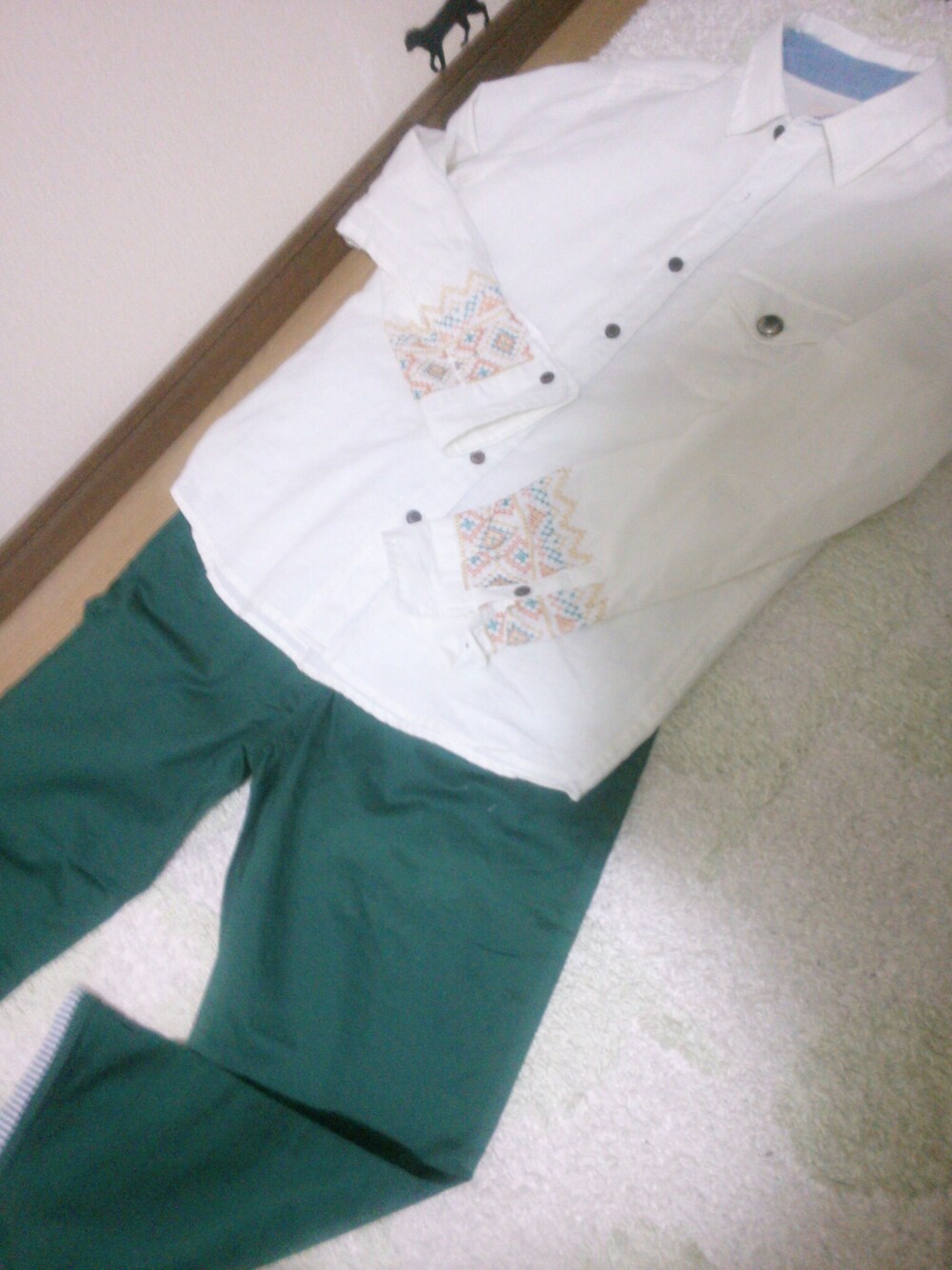 グリーン系のパンツを着用したメンズの秋コーディネートの1枚目の写真