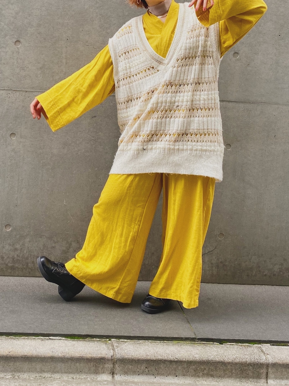 ベストにカラー材がついてる😵笑 . flamingoで買った黄色のセットアップに ZARAのニットベスト! 首元は開きやすいからスカーフを巻く🧣 パキッとしないのでシルバーも添えて。 . . 足下の理想は足袋ブーツとか欲しい