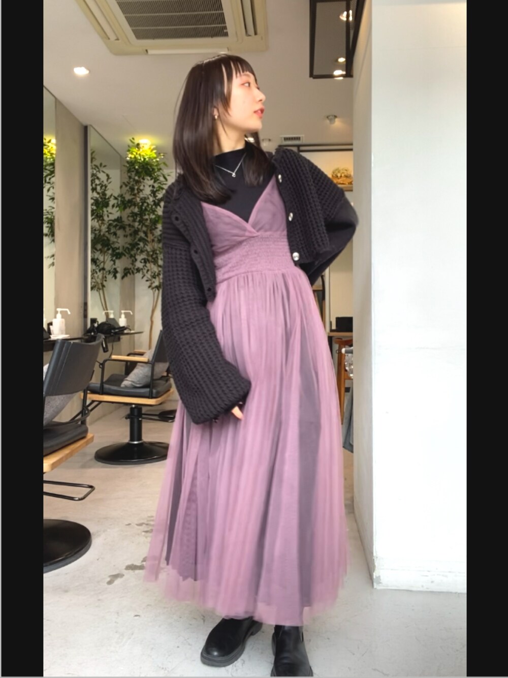 春だけど寒かったので 厚着して中はスモークなピンクのチュールで 軽さを出す! 暑かったり寒かったりで服決めるの難しいなあ!
