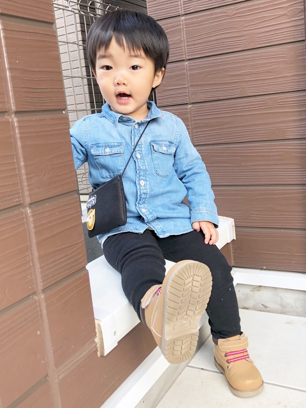 今日はデニムシャツ×黒レギンスで ママと親子リンクコーデでした👩👦💗 一緒に写真撮ればよかった…🙄笑 cheycheyの身につけている サコッシュはハンドメイドで 作りました💼💕 総額300円👛 材料は全てcan do🐣 クッション性のあるスマホポーチに 紐を縫い付けてワッペン貼っただけ🐻 不器用な私でも簡単にできました💖👍🏽 デニムシャツ…H&M(18〜24m) リブレギンスパンツ…UNIQLO(90) ブーツ…西松屋(13.5) サコッシュ…ハンドメイド