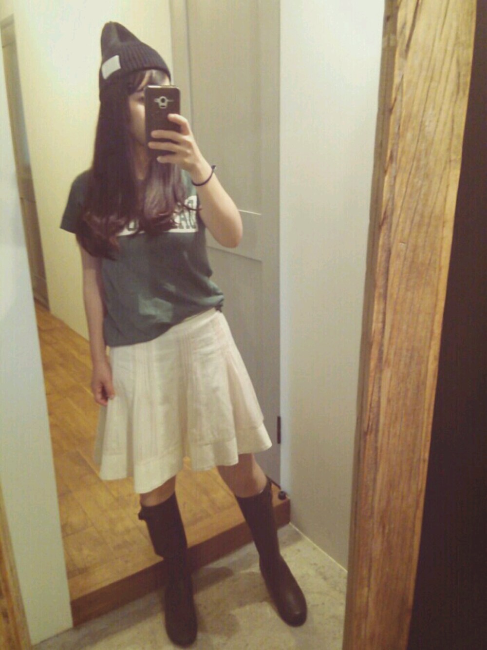 雨の日コーデ。 雨の日はそれはそれで好きです。 もっと脚が細くて長かったら、このコーデで晴れの日にスニーカーとか合わせたいけど、残念ながらそういう脚は持ちあわせてはいないので、レインブーツで脚が隠せる雨の日にこういうコーデをしています。。。