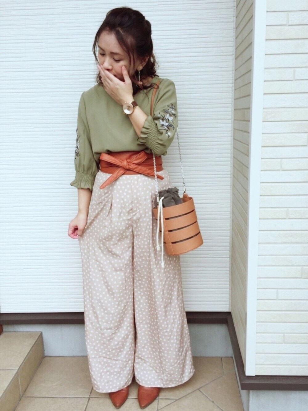 こんばんは(*Ü*)*.¸¸♪" やっとサクラ咲きましたねー🌸 嬉しい(๑⃙⃘ˊ꒳ˋ๑⃙⃘) コーデは安定のプチプラ♡ しまむらで見付けたこのプルオーバーめっちゃ可愛い(*Ü*)*.¸¸♪" 袖の形と刺繍もVネックもツボ♡ しかも1500円やったー٩(ˊᗜˋ*)و✨ 沢山着よう✨ ワイドパンツにGUのサッシュベルトで少しでも足長に😂笑❤