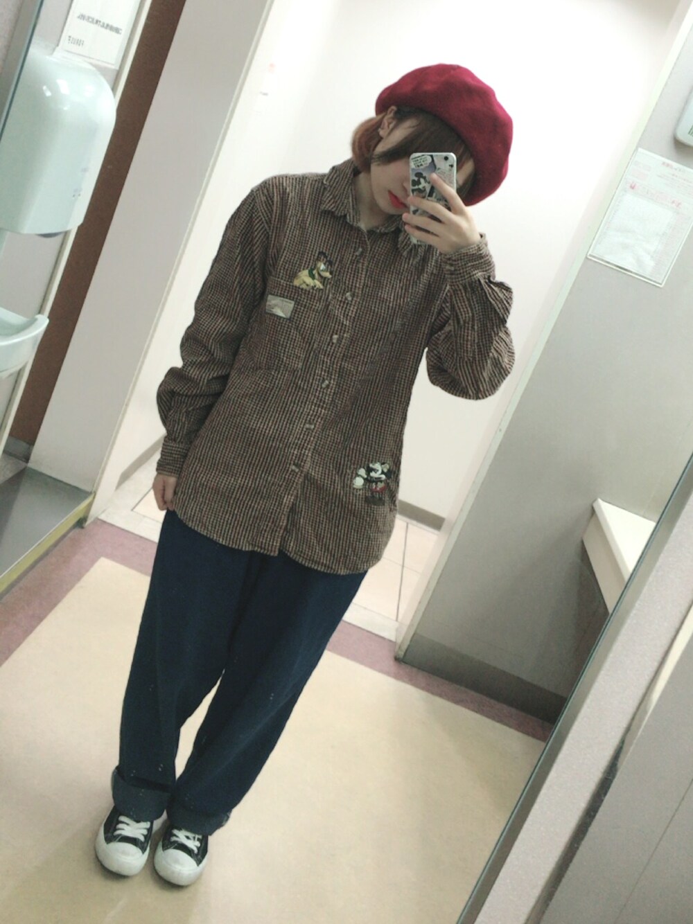 古着コーデです! コーデュロイっぽい質感の シャツには ミッキーとプルートの刺繍が 入ってます\( ˙▿︎˙ )/ めっちゃお気に入り過ぎてやばいです笑