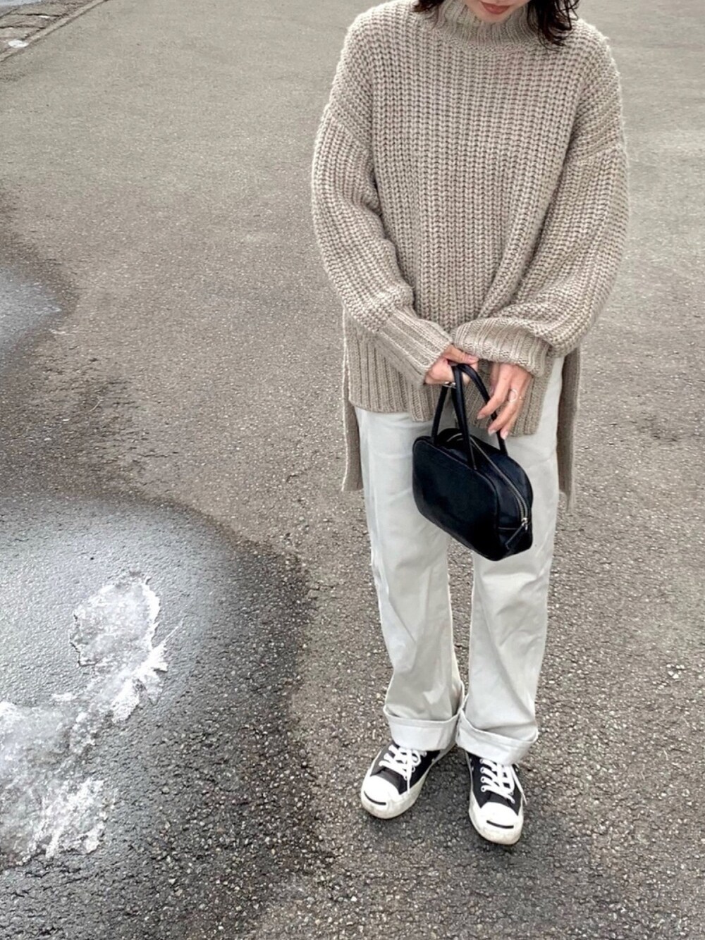 ざっくり大きめニット。前後で大きく長さが違って、ひとくせある感じがスキ◎ ベージュに白、黒小物♡ Instagram→@instaro__