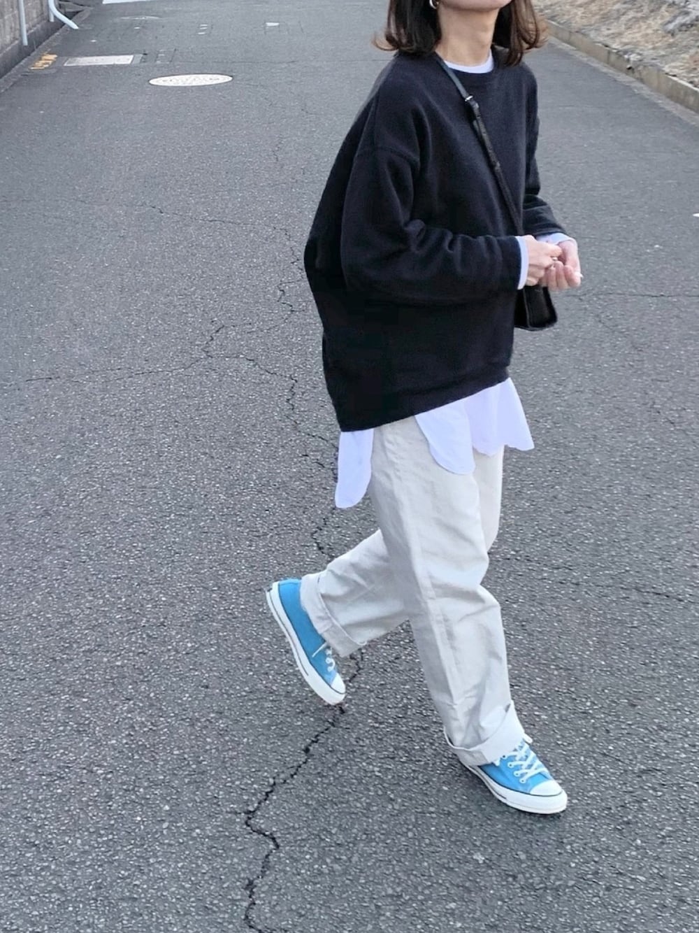 モノトーンに差し色ブルー◎ きれいなブルーでお気に入り♡ FREAK'S STOREのスウェットの形が可愛くて色違いも欲しいなぁ◎ Instagram→@instaro__
